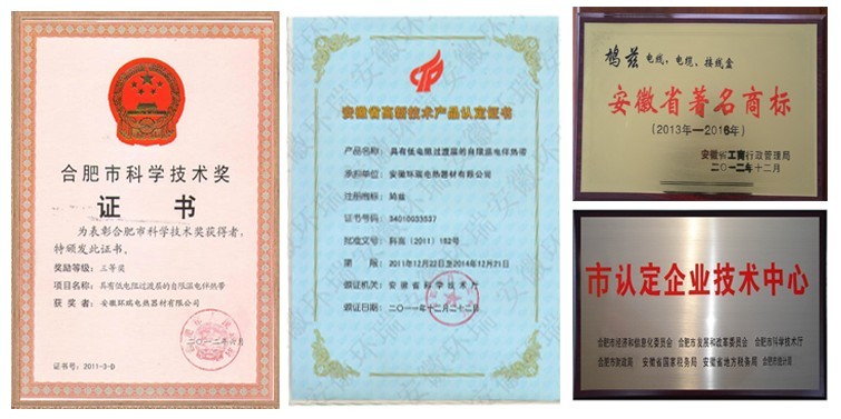 安徽環(huán)瑞擁有21項(xiàng)自主知識產(chǎn)權(quán),其中包括:2項(xiàng)國家發(fā)明專利;4項(xiàng)新型電伴熱帶、發(fā)熱電纜生產(chǎn)核心技術(shù)(1、雙層共擠技術(shù),2、束代絞預(yù)恒張力絞線,3、一體化熱線冷線隱式拼接,4、三層共擠技術(shù));5項(xiàng)核心新型產(chǎn)品(1、具有低電阻過渡層的電伴熱帶,2、一種安全塑料體的電伴熱帶,3耐高溫耐磨的發(fā)熱電纜,4、太陽能熱利用電伴熱帶,5、新型長距離并聯(lián)、串聯(lián)恒功率電熱帶);10項(xiàng)行業(yè)專用電伴熱帶(消防專用電伴熱帶、電廠煙氣脫硫?qū)S秒姛釒А⑻柲軣崴鞅举|(zhì)安全型電熱帶、石油管道伴熱專用電熱帶、汗蒸房專用電熱帶、天溝融雪專用發(fā)熱電纜、混凝土養(yǎng)護(hù)專用發(fā)熱電纜、畜牧養(yǎng)殖專用發(fā)熱電纜等)。安徽環(huán)瑞憑借此項(xiàng)榮譽(yù)獲得了省科學(xué)技術(shù)獎、高新技術(shù)產(chǎn)品證書及國家地暖行業(yè)、省建設(shè)廳榮譽(yù)推廣證書。