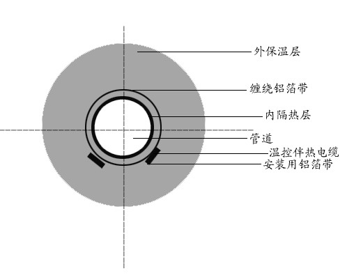 由于蒸汽掃線時(shí)間相對較短。一般控制在30分鐘左右。可采用下圖雙層保溫結(jié)構(gòu)來保證使用。一般來說,這種結(jié)構(gòu)的內(nèi)層保溫厚度為5-10mm.在內(nèi)保溫層外加包鋁膠帶,鋁膠帶上敷設(shè)自控溫電熱帶。每毫米內(nèi)層保溫層可使掃線溫度減低10℃左右,或采用隔離支架,每米1—2只,效果也較理想。當(dāng)然,在掃線時(shí)必須停止通電,管線熱損失仍按常規(guī)設(shè)計(jì),保溫層厚度只能按外層為計(jì)算厚度。