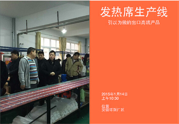 2015年1月14日新年伊始,環瑞迎來了新疆烏蘇市相關領導蒞臨考察,烏蘇市相關領導在環瑞董事長計成志陪同下參觀了環瑞電伴熱帶、發熱地席和環瑞現代化展廳,并在環瑞會議時聽取環瑞員工對環瑞未來發展的相關介紹。