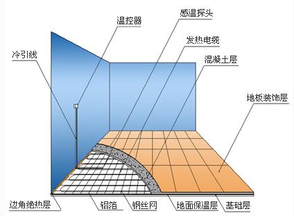 通過鋪設(shè)于地板上的地溫探頭或溫控器內(nèi)的室溫探頭,由房間溫控器控制溫度。當(dāng)室內(nèi)溫度達(dá)到設(shè)定值后,溫控 器開始動作,斷開發(fā)熱電纜的電源,發(fā)熱電纜停止加熱,當(dāng)室內(nèi)溫度低于溫控器設(shè)定值時,溫控器又開始啟動, 接通發(fā)熱電纜的電源,發(fā)熱電纜開始加熱,這樣往復(fù)運(yùn)行。