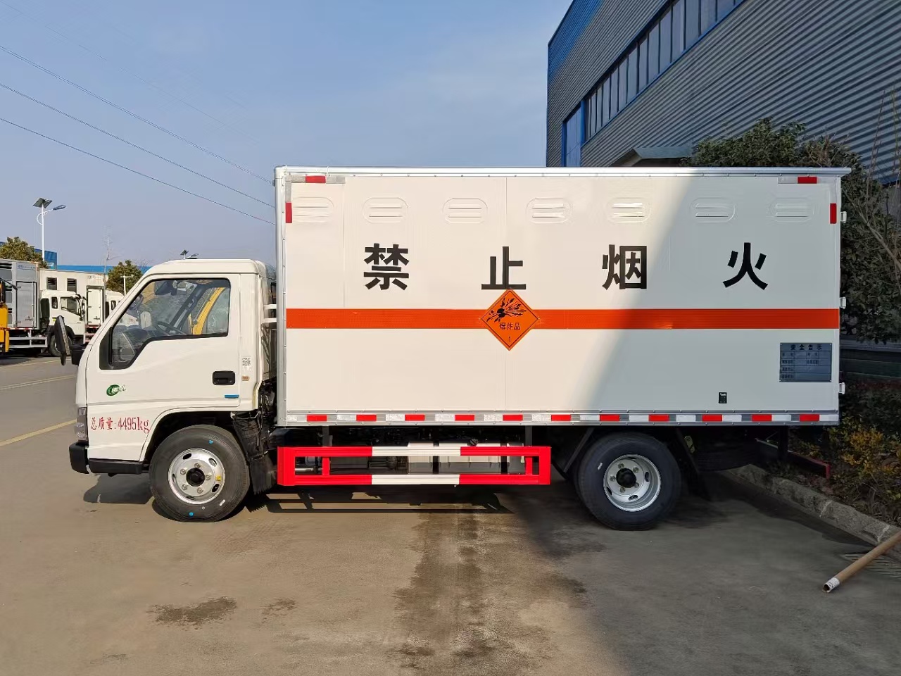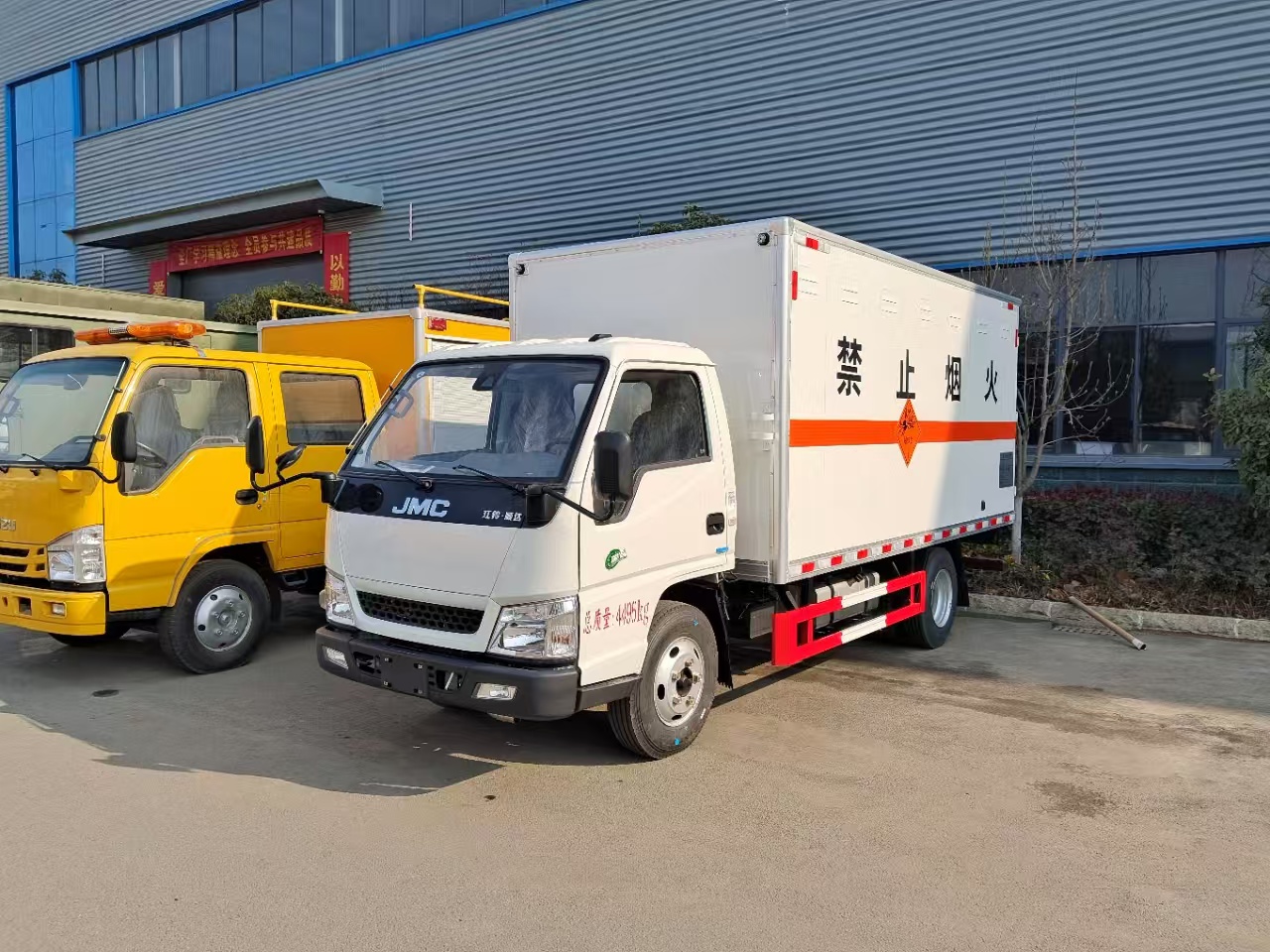 | 貨箱配置 | 廂體為雙層金屬骨架結構,外板采用冷軋鋼板,中間填充阻燃泡沫,內飾為鋁板。底板為平板上鋪防靜電膠皮。廂內兩側加裝固定貨物臥環,門框帶防盜報警器,頂部帶煙霧報警器,廂體右側選裝側門,隨車配2個滅火器,危險標志牌,防火帽,危險品三角頂燈。 | ||