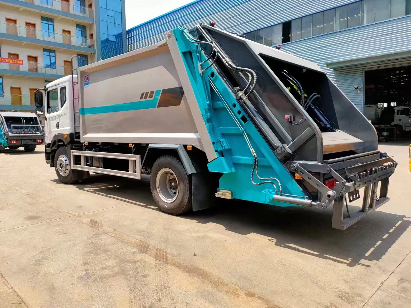 | 上裝配置 | 箱體容積14立方,采用邊四底五高強板制作,填裝器外置滑板油缸結構,機器人自動焊,電泳工藝涂裝,威森博樂多路閥,皖液油泵,填裝器外置滑板油缸結構,尾部翻轉結構可掛120/240L垃圾桶,選裝全密封斗/三角斗。 | ||